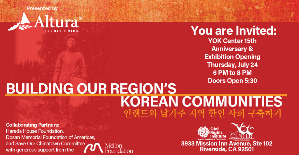 Join us on Thursday, July 24th, from 6 – 8 PM (doors open 5:30 PM) for the opening of our new exhibition and the 15th Anniversary of the YOK Center! The Civil Rights Institute is proud to introduce Building Our Region’s Korean Communities; presented by Altura Credit Union, with support from Q’Vinc and Irma Asberry, the Dosan Memorial Foundation of Americas, Ken and Mary Gutierrez, the Harada House Foundation and Ariel Savage and Theresa Han Savage. This new exhibition highlights the legacy of Korean Americans in the Inland region and beyond. Developed in partnership with the Young Oak Kim Center for Korean American Studies at UC Riverside—founded in 2010 by Professor Edward T. Chang and named for a decorated Korean American WWII and Korean War hero known for his efforts to bridge ethnic divides—this exhibition highlights the early Korean American community’s fight for homeland independence, their work in the local citrus industry, and the ways they established cultural roots in our region. Curated by Director of Public History Dr. Audrey Maier with insights from Dr. Carol Park of the Young Oak Kim Center, this exhibition offers visitors a chance to explore an often-overlooked chapter of history, deepening our understanding of how Korean Americans have shaped the region’s cultural landscape. A highlight of the display is the story of Pachappa Camp, the first Koreatown in the United States.